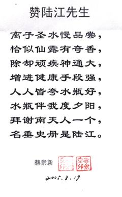 凡尊重中國古代養(yǎng)生智慧的患者,堅(jiān)持“已饑方食”和定時(shí)主動補(bǔ)水者,均可祛病康復(fù)。如牡丹江醫(yī)學(xué)院87歲的張鵬圖飲用半年后高血壓未痊愈,陸江與他通話交流,了解他原先每日主食4兩,建議他用“已饑方食”減少主食肉食量,他理解后,將每日主食減為3兩,少吃兩塊肉,飲用一年治愈26年的冠心病和高血壓。他2003年5月31日來信說:“飲用卓康小分子團(tuán)水是根治高血壓、冠心病、糖尿病的一把金鑰匙,是填補(bǔ)醫(yī)學(xué)空白,為人類造福,應(yīng)推廣該產(chǎn)品。”